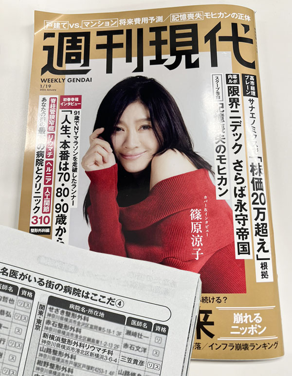 2026年1月19日発行「週刊現代」の「あなたの街の最高の病院とクリニック 整形外科編」に当院が掲載されました。