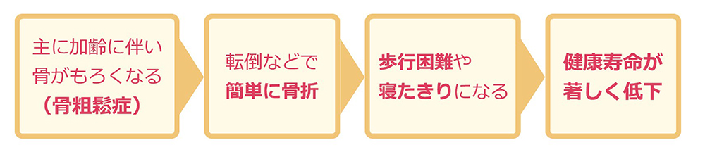 骨粗しょう症そのものは命を脅かす病気ではありませんが、骨粗しょう症による骨折は日常生活が不自由になったり、寝たきりになることに繋がり、健康寿命を著しく低下させる可能性があります。