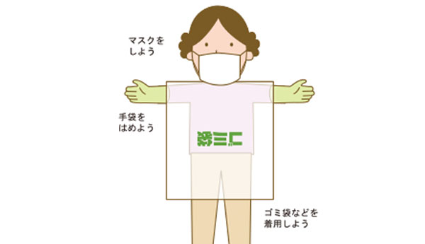 消毒する人は、手袋(ビニール袋を二重にして手首のところをテープでとめても代用できます。)、マスク、エプロン(45Lごみ袋の襟、袖口部分を切り取って使い捨てのものを作ってもOK)を着用します。