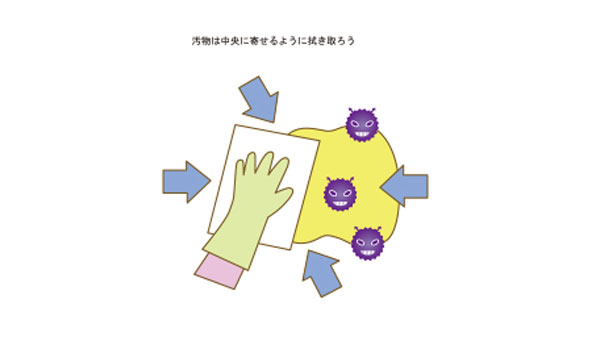 - 嘔吐物に0.1%消毒液に浸した新聞紙をかぶせ、上からラップをかけ、広げないように嘔吐物をとります。